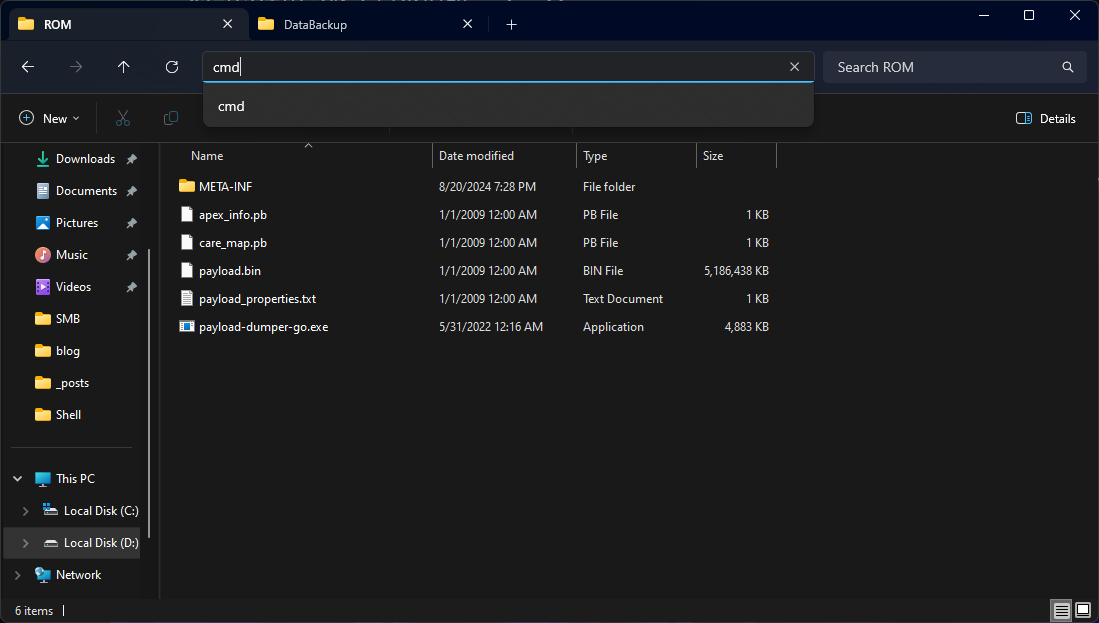 本教程使用payload-dumper-go来提取,将payload-dumper-go.exe放入到有payload.bin的文件夹中,在上方输入cmd并回车,这时cmd的启动路径就在你当前的路径下了
