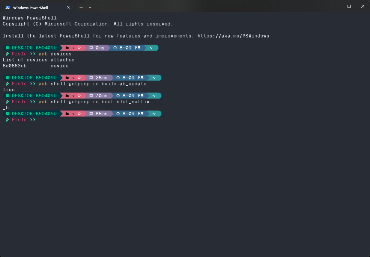 如果确认为AB分区的设备,使用adb shell getprop ro.boot.slot_suffix来查看系统目前所在的分区